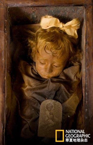 后來的年月里,人們通過壓注化學溶液的方法更好地保存尸體,上帝的這項工作被交接到了制尸工匠和科學家手中。一個禮拜堂里的棺材中長眠著小女孩羅薩莉婭·隆巴爾多,她看起來就像正在臟兮兮的棕色床單下沉睡。羅薩莉婭與其他木乃伊不同,她還有頭發,用一個大大的黃色蝴蝶扎起來,打著卷兒垂在黃色的前額,像布娃娃一樣。她閉著眼睛,睫毛依然絲絲分明,若不是周圍堆著咧著嘴的骷髏、彌漫著腐爛的氣息,她會被錯認為一個在回家的路上打瞌睡的小孩。看著她會想到生與死的差距只在一息之間,這讓人心神難定,毛骨悚然。羅薩莉婭兩歲的時候染肺炎而死,她的父親傷心欲絕,悲痛之余請來遠近聞名的制尸工匠阿爾弗雷多·薩拉菲亞,讓他把女兒的遺體保存下來。制成后的效果栩栩如生,哀慟之情似乎仍縈繞在那顆頂著金發的小腦袋上。在巴勒莫,人們把羅薩莉婭視為一個神奇的小天使。出租司機會問:“你看到羅薩莉婭了嗎?可漂亮啦。”