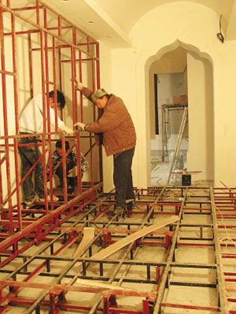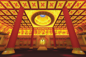 走進展覽大廳,正中間就是出土于南京大報恩寺遺址名揚四海的七寶鎏金阿育王塔的主展區,設計師用“天圓地方”來形容他對核心之處的設計理念。崇圣殿的大廳內從地面到屋頂估計有9米高,記者看見施工單位搭起了3層高的腳手架,幾名工人正在為圓頂上色,“圓頂共制作了三圈,最大的一圈直徑2.4米,一圈比一圈縮小,這樣可以體現出一種神秘的層次感。18幅飛天壁畫盤旋在圓頂周邊,最高一圈內畫上藍色的夜空,然后安裝LD最新燈光系統,16盞射燈對應的地方是方形的仿漢白玉基座,座上四邊是進口的鋼制廊桿!庇浾咦铌P心的是基座上究竟陳列什么文物?無疑是大家都想要看到的,美麗無比的七寶鎏金阿育王塔。