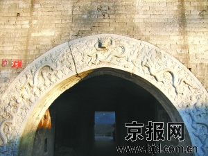 岱王廟坐落在盧溝橋西側的橋西街5號,坐北面南。遠遠望去,岱王廟建造的十分精巧,醒目。當地百姓俗稱它為大王廟或大廟。岱王廟的山門和戲樓,平面呈T字形布局,銜接緊密,融為一體,是一座上下二層硬脊歇山頂磚木結構的建筑。歷經滄桑歲月,房脊兩頭的吻獸早已蹤跡皆無,只有東西山墻頂部的鈴鐺排山,保留的還算完整。整座建筑用青磚砌成,磨磚對縫,對仗工整,呈現了清時期的建筑風格。山門的一層中央是石制拱形券門,券門兩旁是各一長方形豎窗。石制拱形券門刻有石雕,門首弧頂上方雕刻著探首的夔龍,在片片的祥云中翻轉騰挪,吞云吐霧。夔龍兩側各刻有兩條玩耍的蟠龍,像眾星捧月一樣游弋在探首的夔龍身邊。最為有意思的是,石制拱形券門兩側下部的石雕上,各刻有一只在水中山石間吐水的小獸,造型奇特,形態逼真,顯現出十分生動有趣的畫面,給整座石雕增添了一筆頑皮的色彩。整個券門上的石雕布局嚴謹,古樸典雅,雕工灑脫,莊重中不失諧趣,顯示出那個時代工匠們的高超技藝。