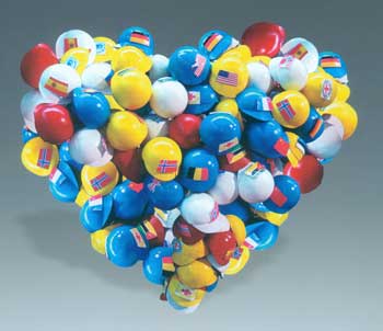構思不同、表達多樣的100多件雕塑,從不同角度展現了地震中人性的堅強與抗爭。如燕山大學藝術學院教師吳新的浮雕作品《我們的畢業照》,展現的是一張老師缺席的畢業照,作者為地震中老師的犧牲精神所感動,并期望將這種感動傳達給觀眾。西安美術學院雕塑系教授周曉東的作品《茂汶蘋果》,雕刻了一個特殊的蘋果,裂了口的蘋果上描繪了重建后的家園圖。他說,是四川人都熟知的汶川和茂縣的土特產蘋果給了他表達的沖動。親自去過災區的周曉東深深地體會到地震中人們的心理障礙,“許多人根本無法面對親人的忽然離去。”所以他更愿意用樂觀的蘋果去感染人的情緒,讓他們感受到生的希望,因為,比自然災難更可怕的是人的絕望。天津美術學院學生韓帥、宋曉燕、李鵬共同創作的作品《關愛》,將貼有各國國旗的五彩安全帽組合成心形,既使觀眾重溫了國際救援愛心行動帶來的希望與感動,也不禁為“80后”藝術家的巧妙構思而叫好。