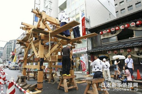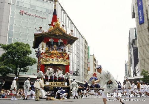 中新網7月19日電 據日本新華僑報報道,時值梅雨季節,日本古城京都又迎來了一年一度的祗園祭的高潮。7月17日上午9時許,32輛用彩色織品裝飾的燦爛花轎彩車冒著牛毛細雨,沿著用竹片鋪就的街道,在京都市中心“花轎巡行”。 過程中最精彩的場面要數在四條河原町的“街口轉向”,10多噸重的彩車在十字路口來了個90度的轉身。當地居民在車輪下鋪滿竹片并灑上水,彩車在“嘎吱嘎吱”的巨響中來回旋轉,博得了現場人群的熱烈喝彩與掌聲。