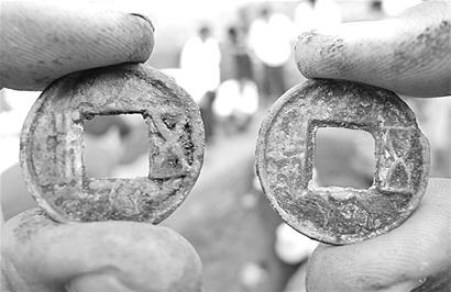 考古人員的動作越來越輕,墓葬的北頭、中部不斷有銅錢被發(fā)掘出來。經(jīng)現(xiàn)場的考古人員確認(rèn),這些都是漢代的五銖錢。記者看到,這些方孔銅錢上的“五”、“銖”兩字十分明顯。