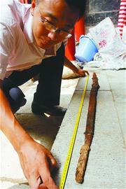 這次出土的幾件鐵器也引起了李銘的興趣。他告訴記者,別小看了這些鐵器,在漢代,這樣的鐵器屬于高檔品,不是一般人能用 的,更不是一般人能享受這樣的陪葬品的。這次出土的鐵器最重要的有3件。第一件是一柄鐵劍,已經(jīng)斷裂為5截,經(jīng)拼接后測量,其長大約1.15米。雖然劍體 銹蝕嚴(yán)重,但依然能看出質(zhì)地優(yōu)良,制作講究。劍柄的造型還基本清晰,劍箍為青銅制作。從這柄劍上,我們可以推斷很多當(dāng)時(shí)的情況,如劍長1.15米,比現(xiàn)在 一般的劍要長,這就說明使用這柄劍的人身材比較高大;根據(jù)劍的形制,可初步認(rèn)定是濟(jì)南當(dāng)?shù)刂谱鳎绻ㄟ^科技手段研究出劍的鐵質(zhì)及其他合金含量,這對研究 漢代時(shí)期濟(jì)南地區(qū)的冶煉史有重要的參考價(jià)值。再說鐵鼎和鐵釜,它們都是漢代時(shí)期的生活用具。其中,鐵鼎為雙耳三足折腹鼎,形狀很好。雖然現(xiàn)在看銹蝕嚴(yán)重, 但在當(dāng)時(shí)不是一般人家能夠使用的,不是官員,至少也是大戶人家,所以這對研究當(dāng)時(shí)的社會生活和陪葬習(xí)俗都有重要價(jià)值。