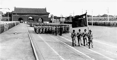隨后,毛澤東等領導人乘車出中南海東門,從故宮西華門南拐至闕右門,再往南直達天安門,登上了城樓的100級臺階……