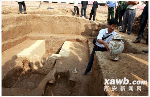 在地宮墓葬南側約4米遠,考古人員還發掘出一個更為少見的墓葬。這是一個距現地表約1米深的長方形豎穴墓坑,長約1.5米,寬約0.8米,其內置放一個高約70厘米、直徑約80厘米的大陶缸,缸口用一大陶盆覆蓋,內中有一具呈盤坐姿態的完整骨架,周圍填有木炭屑及麥草等。張全民介紹說,這是一個僧人的坐化真身,即其彌留之際以盤坐姿待逝,留下完整尸身歸葬。其葬式也可稱甕棺葬,所填充的木炭等物用以吸潮防腐,也確實起到了作用。