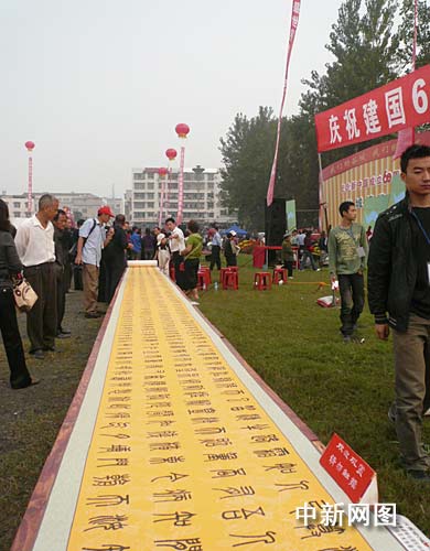 中新社襄樊9月29日電 (涂玉國)長一百一十米、寬零點八米,用五種字體書寫的毛主席詩詞的書法長卷,二十九日在湖北省襄樊市谷城縣博覽會上現身。這是該縣文化館副館長、書法美術家協會主席許祥強為慶祝新中國成立六十周年而作。
