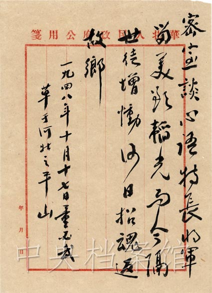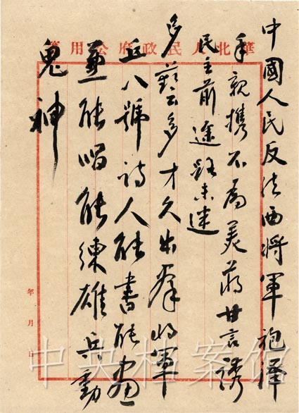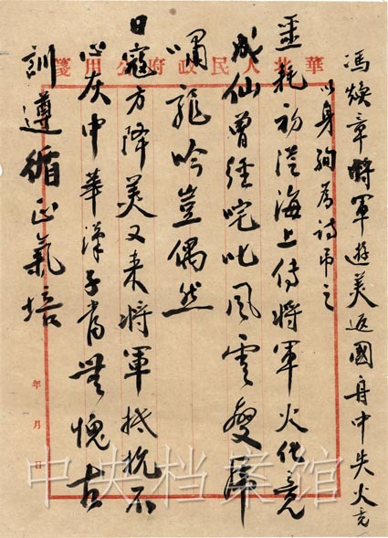 1949年 9月 1日,馮玉祥遇難周年祭日追悼會在北京舉行,出席者有李濟深、宋慶齡、周恩來、沈鈞儒、張瀾、何香凝、郭沫若、林伯渠、吳玉章、董必武及馮玉祥夫人李德全等 600余人。毛澤東、朱德及各民主黨派、各人民團體送了挽聯花圈。毛澤東親筆題詞: “馮玉祥將軍逝世周年紀念謹致悼意。 ”周恩來在致詞中說:馮玉祥先生從一個典型的舊軍人轉變成為一個民主的軍人,他經過了曲折的道路,最后走向新民主主義的中國。馮先生堅決地拒絕了美帝國主義對他的誘惑,毅然離美準備回到中國解放區,接受參加新政治協商會議的號召,不幸遇難,實值得大家紀念。