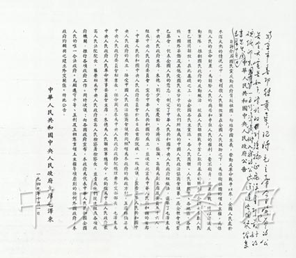 毛澤東主席莊嚴宣布:“中華人民共和國中央人民政府已于本日成立了。”并且親手升起國旗——五星紅旗。升旗儀式后,毛澤東宣讀《中華人民共和國中央人民政府公告》。