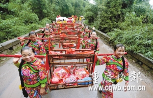 拜別只能在自己的婚禮中守在家里的爹娘,在侄子坐上滑竿成為送親人后,頭頂蓋頭的新娘淚流滿面地鉆進花轎,并在規(guī)定時間起轎,由轎夫和迎親、送親隊伍徒步送往婆家。