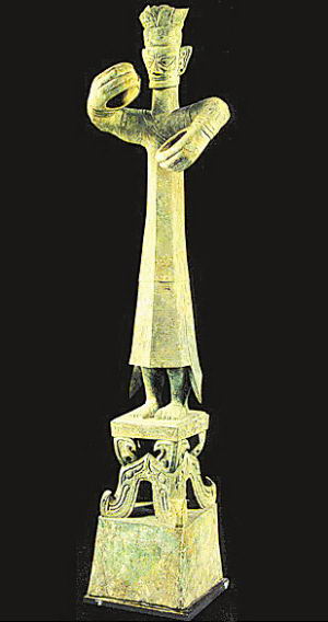 那么,“縱目”的蠶叢是什么樣子?在四川省廣漢市三星堆兩個(gè)商代大型祭祀坑中的上千件蜀國(guó)珍貴文物面世之前,歷代學(xué)者百思不得其解。三星堆出土的縱目青銅面具和青銅大立人,據(jù)考古學(xué)家論證,就是蠶叢的形象。這使得自古以來(lái)真?zhèn)文娴墓攀袷穫髡f(shuō)成為信史,也為蠶叢縱目的傳說(shuō)提供了實(shí)物佐證。