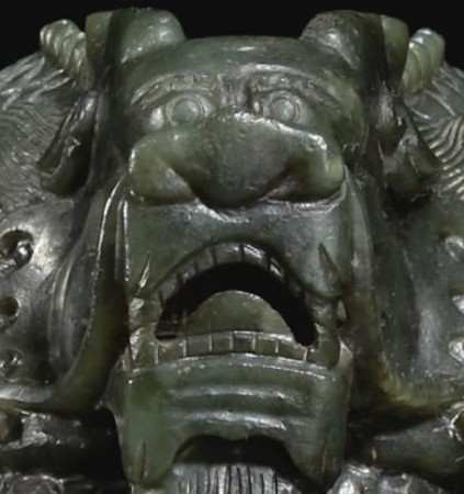 李教授同時指出此次拍賣的“八徵耄念之寶”印龍爪、頭部紋飾雕工疲弱而少章法、刀法。龍的發(fā)紋不上沖,火焰紋并不上揚,龍爪粗野乏力、沒有抓力,缺乏動感,似走獸類臥伏在地面一般,龍脊拱沿處造型用,用刀不干凈表現(xiàn)無弧勢,顯出臃腫、毫無生氣,因造型力度沒把握好,鼻部中軸整塊竟不居眼、口正中,電腦圖片放大后看到門牙和邊牙竟上下鋸裂,此應為機雕出了差錯留下的殘缺,龍的形狀與面部表情呈驚恐狀,毫無龍威,粗糙得象磚雕,更無皇家氣象(圖五)。而拍賣玉璽竟煞有介事地配了個底坐“以舊充好”,以示此玉璽大有來歷,作偽者殊不知清宮玉璽多封黃綬帶(配綬帶寓意長壽,也是使用方便),并承之以紫檀木匣。大部分寶匣并加以雕工或描金,以彰顯出玉璽的尊貴與皇家氣象。