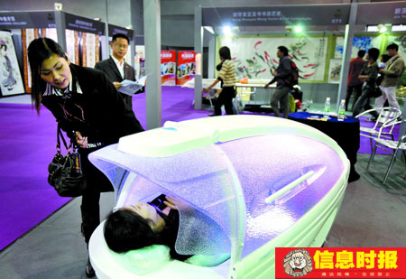 “這是家庭用的水療美體太空艙,過去只在國外流行,現在是在中國很流行。”來自北京某醫療器械公司負責人沈麗娟說,中國人很講求私密性,到美容院做美體水療不如在家來得舒坦。這臺家用式水療美體太空艙集沐浴、水療、按摩、干溫蒸等功能于一體,內部還設紅外線治療、LED藍光治療等,而且可以一邊做美體一邊聽音樂、睇電視。