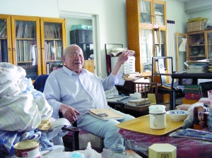上午10時,我和思猛兄在東岳廟牌樓前聚齊,步行到達王老寓所,門是虛掩上的,輕輕地敲門后,隨著老人響亮地“請進”聲,我們應聲而進。王老時已93歲高齡,但精神矍鑠,舉止言談,很難讓人把他和93高齡聯系到一起。