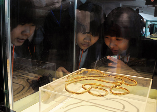 記者發現,精心挑選展出的珍品則藏身在三號展區的六號宮內,這里完全模仿古代造船龍骨的骨架搭建的展廳,置身其中,彷佛處在古船的核心艙位。記者看到,曾經引起極大轟動的“南海一號”出水文物—青釉菊瓣紋瓷盤就擺放在醒目處,一眼望去,該瓷盤宛如菊花綻放,而盤底則彷佛盛了水一樣,晶瑩剔透。
