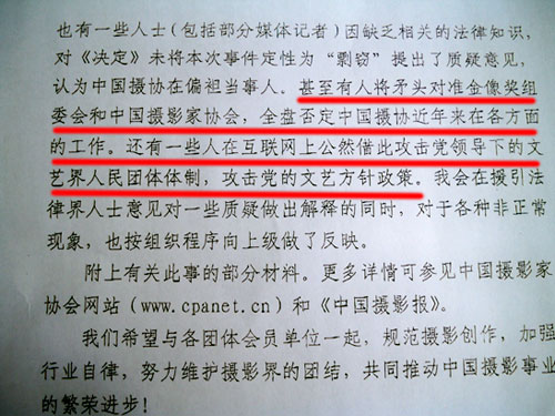 怎么可以使用思想如此陳舊的秘書,來起草這樣陳腐的、充滿“階級斗爭火藥味兒”的協會文件?而且,明明是因為自己的失察,造成可能在世界攝影史上也不多見的所謂多人聯合創造照片并且榮獲“金像獎” 的怪異典型,卻還在責備別人:“將矛頭對準金像獎組委會和中國攝影家協會,全盤否定中國攝協近年來在各方面的工作。還有一些人在互聯網上公然借機攻擊黨領導下的文藝界人民團體體制,攻擊黨的文藝方針政策。”
