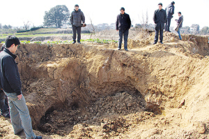 高淳縣文保所的王所長(zhǎng)告訴記者,根據(jù)他們的考古經(jīng)驗(yàn),和以前工地施工現(xiàn)場(chǎng)的挖掘痕跡比對(duì),這個(gè)近千平方米的施工現(xiàn)場(chǎng),雖然溝壑縱橫,但許多散落其間的坑洞,明顯不是正常施工留下的痕跡,而是使用大型器械專選漢墓室挖掘。