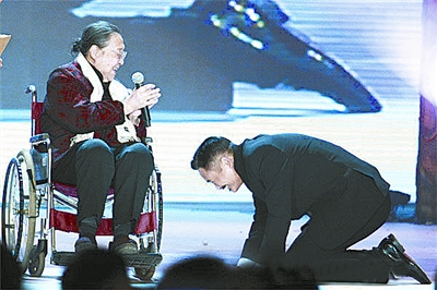 被譽為2010中國第一史詩巨片的《孔子》,1月中旬在北京舉行首映慶典,慶典上孔子的第77代嫡孫女孔德懋女士坐著輪椅上臺,周潤發便一直在旁邊像子侄一樣跪著聽老太太講話。孔德懋女士盛贊周潤發在電影《孔子》中飾演孔子的精彩表演,并將寫有“永遠的孔子”的橫幅贈送給發哥。這時,周潤發出人意料地向孔女士認真雙膝跪地叩首,隨后,與孔女士溫情擁抱,場面令人動容……