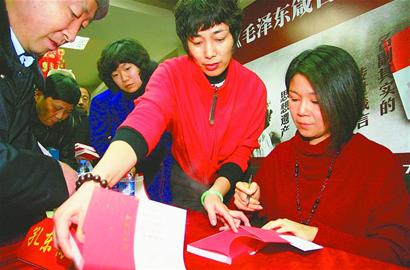 3點(diǎn)30分,簽售活動(dòng)正式開始。人們按照順序,依次走到簽售臺(tái)前請(qǐng)孔東梅簽名,有的人還對(duì)其表達(dá)著對(duì)毛澤東的熱愛(ài)之情,有的則和她合影留念。