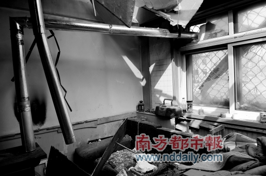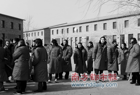 2月23日,正陽藝術區值班的藝術家們,只得圍坐在炭火邊取暖。自2009年11月起,藝術家們原先租住的房屋已經被斷水斷電,而前一天,原先可生爐子居住的維權辦公室,已被不明身份的人士用大型機械掀去屋頂,房門及窗戶等均被砸爛。