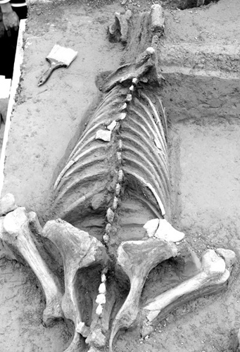 參與發(fā)掘的中國社科院考古所副研究員李存信說,以往發(fā)掘的墓葬中陪葬馬匹一般為側臥,直立的并不多見。他初步推斷,馬所處的馬槽是專門用于固定馬的站立姿勢的,由于沒有掙扎的痕跡,馬應是死后被人卡在槽中,才得以保留了現(xiàn)在的姿勢。