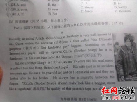 從紅網高校論壇相關截圖中,網友可以清晰地看到試卷是九年級英語試卷。試卷內容簡單介紹了“犀利哥”在網絡上的突然出現,并被稱為“乞丐王子”引起了網民的關注,并在第二段對“犀利哥”的身世等做了一個簡單的介紹。