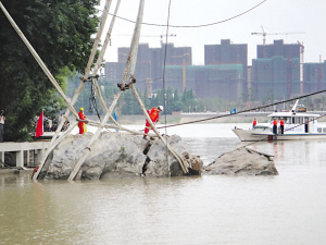 1時14分,巨石剛上升沒多少,只聽見“嘣”的一聲巨響,從巨石上破裂剝落出幾塊石頭,跌落江水中濺起一陣水花!“巨石裂了!”不知誰喊了聲,大家的心都提到嗓子眼,擔心巨石還會進一步開裂,全都眼睜睜盯著“勇士”號的吊臂。“勇士”號上的工作人員當然也意識到了巨石的碎裂,在短暫的沉寂后,開始緩緩將吊纜下放。記者看到,當白色尼龍纜松開后,巨石上出現(xiàn)了一條較大的斷裂口。經(jīng)過現(xiàn)場專家研究,打撈工作暫停。