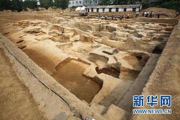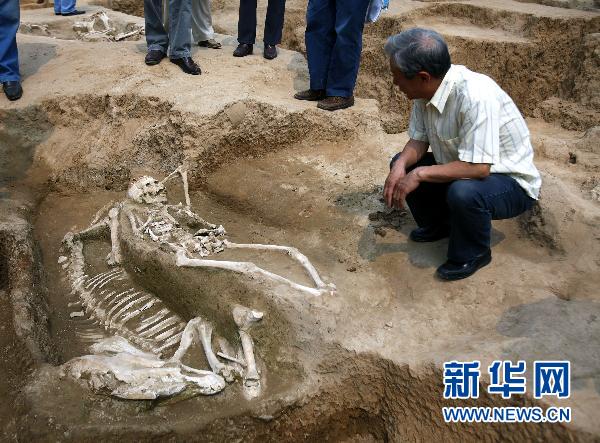 這是6月6日拍攝的洛陽市林校西周洛邑祭祀遺址的人馬組合坑。當(dāng)日,河南洛陽市文物局組織專家對洛陽市林校西周洛邑祭祀遺址考古發(fā)現(xiàn)進(jìn)行研討并向媒體發(fā)布了發(fā)掘成果。這處遺址西距瀍河約1公里,西北距北窯西周墓地及西周鑄銅遺址約4公里,總發(fā)掘面積為945平方米,于2009年2月開始發(fā)掘。考古人員在洛陽市林校工地共發(fā)現(xiàn)西周灰坑59座、流水溝1條、墓葬14座以及唐代灰坑42座,其中31座西周祭祀坑的發(fā)現(xiàn)是本次發(fā)掘的重要收獲,為尋找西周洛邑城址提供了又一重要線索。新華社發(fā)(張曉理 攝)