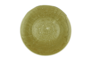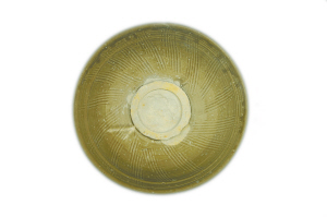 枇杷黃、釉色潤、深腹、斂口、小圈足的小碗,碗口以下弧線內收,器內壁劃刻簡筆花草間配“之”字形篦紋,器外通體劃刻折扇紋,這種特色的中國瓷應“珠光”大師之名被譽為“珠光青瓷”,馳名世界。