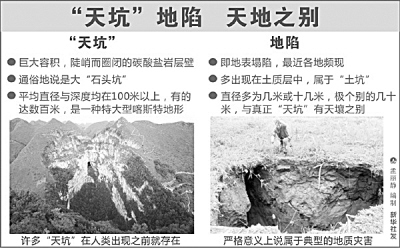 最近各地頻頻出現(xiàn)的塌陷,其實(shí)應(yīng)該稱(chēng)為“地陷”。嚴(yán)格地說(shuō),地陷與天坑二者不是一個(gè)概念。地陷是地面塌陷,天坑是一種喀斯特地貌的專(zhuān)屬名稱(chēng)。