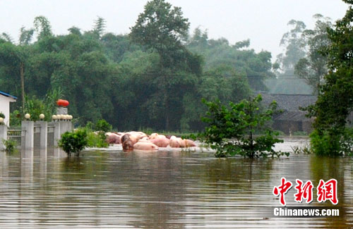 18日早上,中新網記者在受災嚴重的重慶潼南柏梓鎮看到,雖然雨已經停歇,但鎮上的洪水仍未褪去,多條街道的積水仍有半人深。洪水完全包圍了當地的一個養豬場,近百頭被淹的活豬成片浮在水面上,據該場工作人員介紹,該豬場養的6000多頭豬均被洪水淹沒,僅17日便死了1000多頭豬。因豬場受困之處水位較深無法救援,豬場場主只能眼睜睜看著豬被洪水沖擊漂浮。