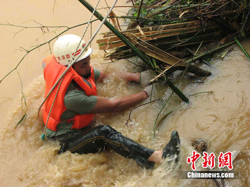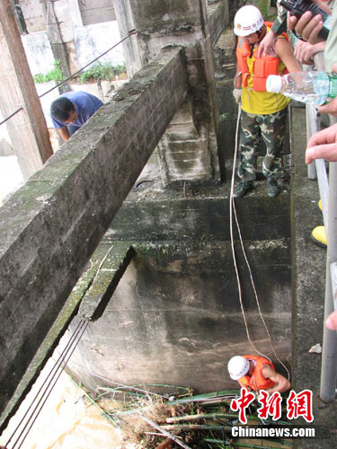 大壩閘門下,水深近6米,水流異常湍急,洪水也異常冰冷,且堆滿了垃圾,雖然消防官兵做好了安全保護,并關好閘門,下游也安排了漁船隨時準備救人,但是水下的情況不明,一不小心就有被洪水沖走或被水下雜物扎傷的危險。在其中靠近岸邊的一個孔閘門,大樹與竹子卡在閘門的中間,閘門無法放下,消防官兵只能在異常湍急的水流中作業,由于缺少著力點,水下的消防官兵多次沒入水中,險象環生,經過近20多分鐘的作業才將雜物捆住。