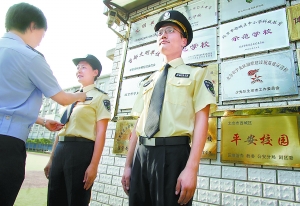 昨天(25日),北京市首批校園安全護衛大隊的175名隊員被分配到了原西城區49所學校的58個校址。開學后,這些身著黃色標準制服,經過半個月魔鬼訓練,學習了格斗和急救技能的護衛隊員將擔負起護衛校園安全的重任。