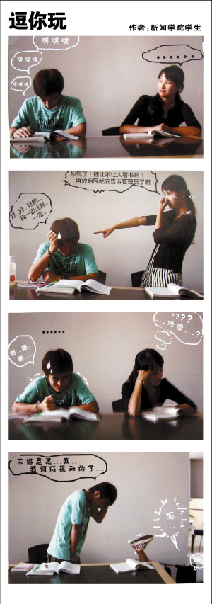 因?yàn)槭堑谝淮闻恼嫒寺嫞愡b他們在“擺拍”的過程中還碰到了許多好玩的事情,“我們的漫畫是要表現(xiàn)一個(gè)很多人都曾遇到過的難題——在大學(xué)城里,到底是坐公車劃算還是買輛自行車劃算。我們事先設(shè)想了各張圖片的表情動(dòng)作,選景在人多的公車站,比如有一張是要我用很夸張白癡的表情來表現(xiàn)看到塞得滿滿的公車,剛好有一個(gè)女生看到了,以為我在看著她,刷地一下臉就紅了……”
