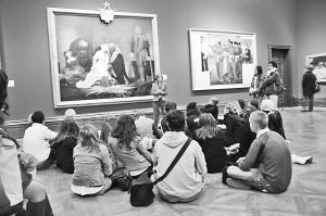 和中國的情況不同,歐美國家的中小學(xué)生則把去美術(shù)館視為平常之事,西方人從小就有定期參觀美術(shù)館、博物館等公共文化空間的習(xí)慣,而歐美國家的美術(shù)館、博物館也把為孩子服務(wù)看作最重要的工作之一。記者曾先后去過法國、英國采訪,發(fā)現(xiàn)無論是法國的盧浮宮、大皇宮國家美術(shù)館,還是英國的大英博物館、國家畫廊,到處都可以看到孩子的身影,而且不少是由學(xué)校組織帶隊參觀,甚至還有一些老師直接在美術(shù)館里為學(xué)生上課。