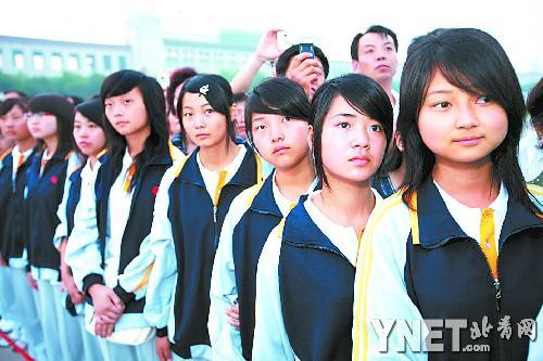 昨天凌晨4點(diǎn)多,天安門廣場上陸續(xù)來了四批特殊的客人:首鋼高級技工學(xué)校、工貿(mào)技師學(xué)院、實(shí)驗(yàn)技工學(xué)校、無線電動力技工學(xué)校四所學(xué)校接收的119名災(zāi)區(qū)技校生不約而同地來看升旗。與前兩天相比,他們的情緒明顯高漲了許多,互相嬉笑著拍照。之后,人民大會堂、國家大劇院、“鳥巢”、水立方、故宮都成為他們的目的地。工貿(mào)技師學(xué)院的23名學(xué)生甚至在國家大劇院門前跳起了韻律操,有的還跑起了圈,嘴里念念有詞地用四川話喊著他們的跑操口令。其他參觀者都圍了上來,饒有興味地看著。(解麗)