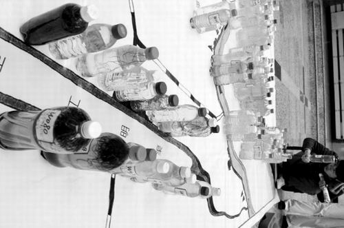 我們每天呼吸到的空氣,被裝進(jìn)了藍(lán)色的氣球里,高高地飄在地圖的最上面。它代表著沈陽(yáng)市的藍(lán)天。氣球下面用透明的繩子拴著幾十張照片。仔細(xì)一看,這些照片有渾河沿岸美麗的風(fēng)光、有夕陽(yáng)、有綠樹(shù),有老人垂釣、有兒童嬉戲,也有學(xué)生們拿著瓶子取水樣的場(chǎng)景。而在地圖的最下方,則是一張平面的手繪渾河、衛(wèi)工明渠等沈陽(yáng)水質(zhì)圖。圖的上面擺放著大小不一的塑料瓶,瓶里裝著學(xué)生們采來(lái)的水樣。