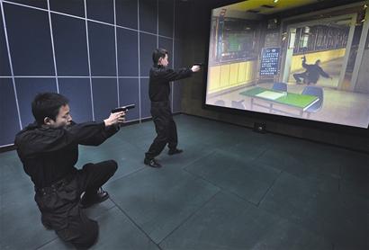 射擊訓(xùn)練中心的實(shí)戰(zhàn)模擬射擊室更有現(xiàn)場(chǎng)感。屏幕上,兩名持槍劫匪突然出現(xiàn)在某銀行營(yíng)業(yè)部,接到報(bào)警后,警察將現(xiàn)場(chǎng)包圍,對(duì)峙談判無(wú)果后,歹徒舉槍射擊,面向屏幕的教官涂明焰和王強(qiáng)同時(shí)開(kāi)槍,兩名歹徒應(yīng)聲倒地,任務(wù)成功!“這是無(wú)線電波覆蓋區(qū),訓(xùn)練者的任何動(dòng)作都反映在屏幕內(nèi)。”涂明焰介紹。據(jù)了解,控制中心有上千個(gè)不同犯罪模擬場(chǎng)景,同一現(xiàn)場(chǎng)中,歹徒可能持刀,可能持槍,也可能投降,現(xiàn)場(chǎng)民警必須根據(jù)具體情況,選擇是喊話勸降,是使用胡椒噴霧器、警棍,還是開(kāi)槍射擊。