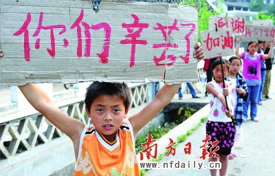 去年“5·12”大地震后,徐廣高舉著寫有“你們辛苦了”字樣的感恩牌向路過的救災隊伍致謝,此事被眾多媒體報道后,人們稱他為“舉牌娃娃”。 2008年6月6日,徐廣和其他130多名來自青川馬鹿鄉小學的同學開始了在東莞的復學之旅,他們被分別安排在博雅外國語學校和石碣的勤徑小學就讀,所在班級被命名為“汶川班”,而這學期他們都選擇了返鄉復課,班級的名字是別有深意的“川莞班”。
