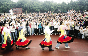 初三和高三的十幾名老師也來助興,女老師們一身中性的牛仔打扮甩開嗓子唱得正歡,男老師們則打了絲巾穿著長長的裙子跳著搞笑的舞蹈,有的老師自己也禁不住一邊跳一邊笑,笑痛肚皮的學生大有人在。“太搞笑,太好玩了,想不到平時那么嚴肅的老師還會跳舞。”一位高三的男同學說。