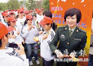 為讓學(xué)子們感受當(dāng)兵的光榮,市征兵辦還請(qǐng)來三位“形象大使”現(xiàn)場(chǎng)宣傳。她們是三醫(yī)大的唐甜和楊菁,以及重慶警備區(qū)女戰(zhàn)士唐勇。唐甜和楊菁是國(guó)慶閱兵式上女兵方陣的一員,她們?cè)陂啽缴系娘S爽英姿讓人記憶猶新。而18歲的唐勇雖去年才入伍,但已榮立二等功。