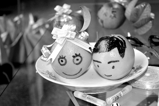 “水果賀卡是種取代傳統紙質卡片的新型賀卡,以蘋果、橙子、香蕉等日常水果為材料,用在上面寫字、繪畫、粘貼寫有祝福語的彩色絲帶等方式來裝扮。”