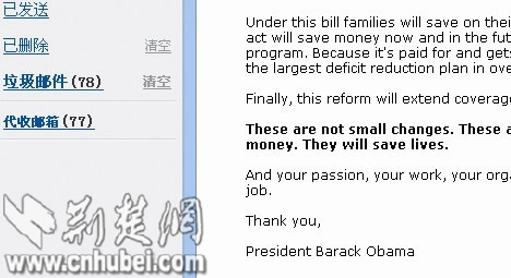 荊楚網消息 (楚天都市報)(記者蔡青)華中科大新聞碩士楊志為一年前曾給奧巴馬的個人官方網站發出郵件,提出關于醫改的問題。沒想到上個月卻收到4封回函!捌渲杏袃煞庵苯邮鹈绹偨y奧巴馬,還有其視頻簽名!弊蛉,楊志為高興地告訴記者。