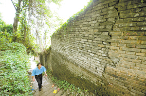 南岸區(qū)海棠村,某在建小區(qū)內,一個10米多高的土堆出現(xiàn)裂縫,其底部緊靠著的圍墻墻體,也發(fā)生松動。當地10多個在海棠溪小學上學的小學生,經過這段圍墻旁的石板路時,都提心吊膽,不得不先駐足察聽有無異常響動,確認安全后再小跑通過。
