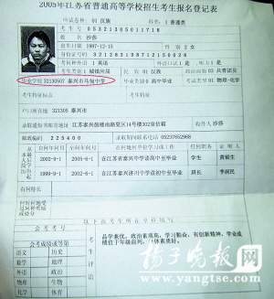 就讀于江蘇教育學院、今年大四的泰興籍女生沙莎,臨近畢業時才驚訝地得知,4年前那份證明她“身份”的《普通高等學校招生考生報名登記表》,“篡改”了她的“身世”,畢業學校明明是“江蘇省泰興中學”的她,被寫成了“泰興市馬甸中學”。結合女兒當年高考成績“很出乎意料”,昨天,擔心女兒成又一個“羅彩霞”的沙先生向本報記者反映,“很可能有人在故意篡改檔案”。