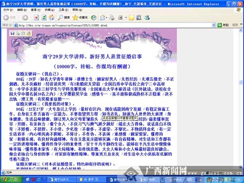 在啟事中,“南寧講師懸賞征婚”特別說明,為表征婚誠意,一旦征婚成功,對網(wǎng)友轉(zhuǎn)帖、媒人中介等人士有2000元至5000元不等的酬謝,總額不超過5000元。“南寧講師懸賞征婚”還特別聲明他不是有錢人,經(jīng)濟(jì)適用男一個(gè),希望不要出現(xiàn)騙婚的事件。