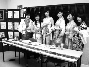 絢麗的旗袍和女孩子們的笑容贏得了極高回頭率。很多英國人來問哪里可以買到旗袍。姑娘們就抓住這個機(jī)會向外國學(xué)生介紹中國的餃子、書畫等。