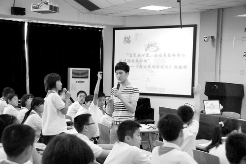 杭州建蘭中學(xué)的李明老師在語文課上與學(xué)生一起討論新文學(xué)觀。(資料照片)