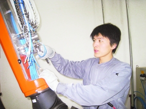 車間的流水線突然發出報警,機器人隨之停止工作。4月10日上午10時,楊雪峰正坐在中控室監視流水線運轉,面前的紅燈閃個不停。他拎起工具包,和師傅跑到報警機器前。一個兩米多高的機器人“罷工”了。“這個機器人是專給車身噴漆的,它一停,整個流水線就不能運轉了。”楊雪峰控制住心里的緊張,緊握扳手的右手有些微微顫抖,爬上流水線和師傅一起查找原因,“進廠后就沒修過機器人這個大家伙,在師傅身后學了半年,這回終于派上用場了。”