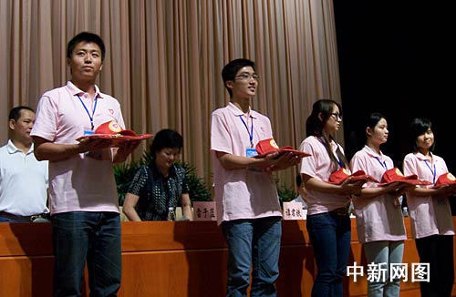 在2008年服務(wù)西部的志愿者代表發(fā)言后,全場(chǎng)志愿者進(jìn)行了宣誓。隨后,雷于藍(lán)為即將開赴廣西、四川汶川、甘肅隴南和貴州四省區(qū)的四支服務(wù)隊(duì)授旗。