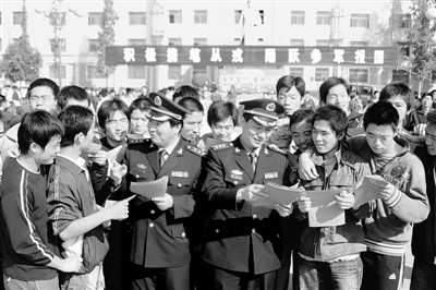 13萬大學生進軍營,是在一個特殊的背景下提出的。今年3月5日,十一屆全國人大二次會議上,國務院總理溫家寶在政府工作報告中明確提出,高校畢業(yè)生可“到農(nóng)村基層服務和參軍入伍”。為鼓勵高校畢業(yè)生攜筆從戎,教育部、財政部、總參謀部等部門專門出臺了八項優(yōu)惠政策。這些舉措,充分體現(xiàn)了國家對應屆大學畢業(yè)生的關懷。但是,軍隊敞開大門征召大學畢業(yè)生的意義和作用,不僅僅是為了單純地緩解社會就業(yè)壓力,更蘊含一個深刻的時代主題。
